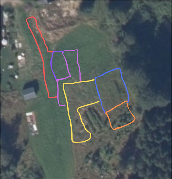 På kartet kan du se hvordan vi flyttet og utvidet område grisene gikk på. Område nederst til høyre var der dem oppholdt seg de første ukene. Dette gjorde vi for å redusere skadene på jorda ved å ha dem lenge på ett sted, og for å gi dem nytt ferskt gress.