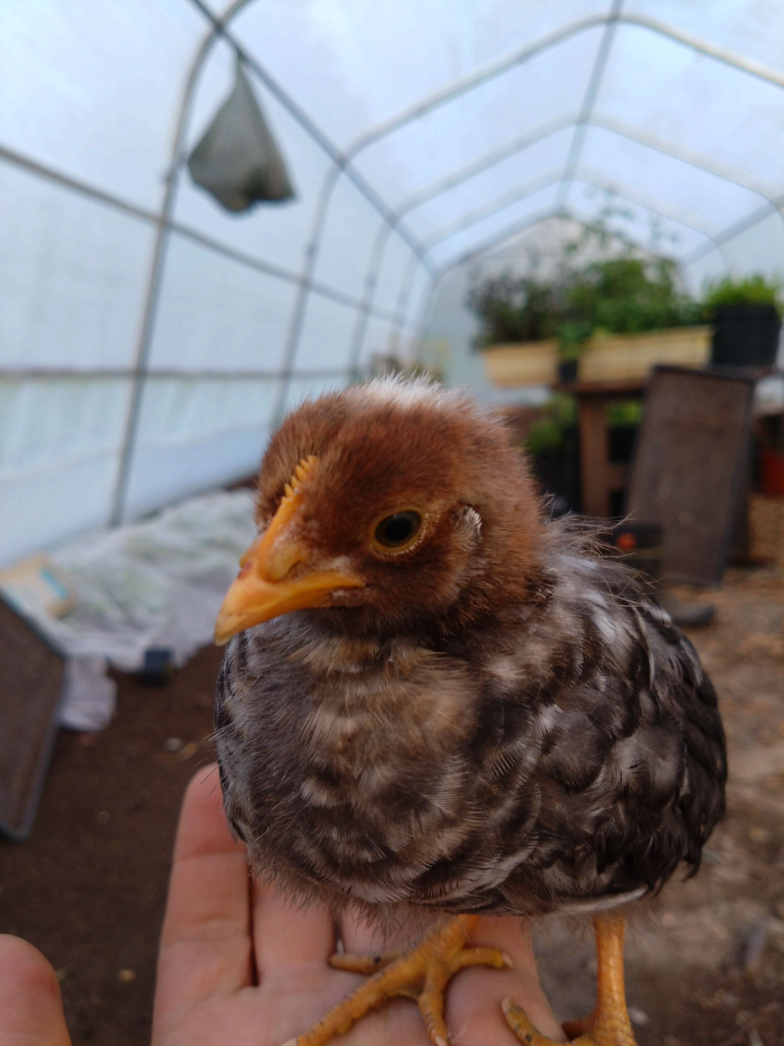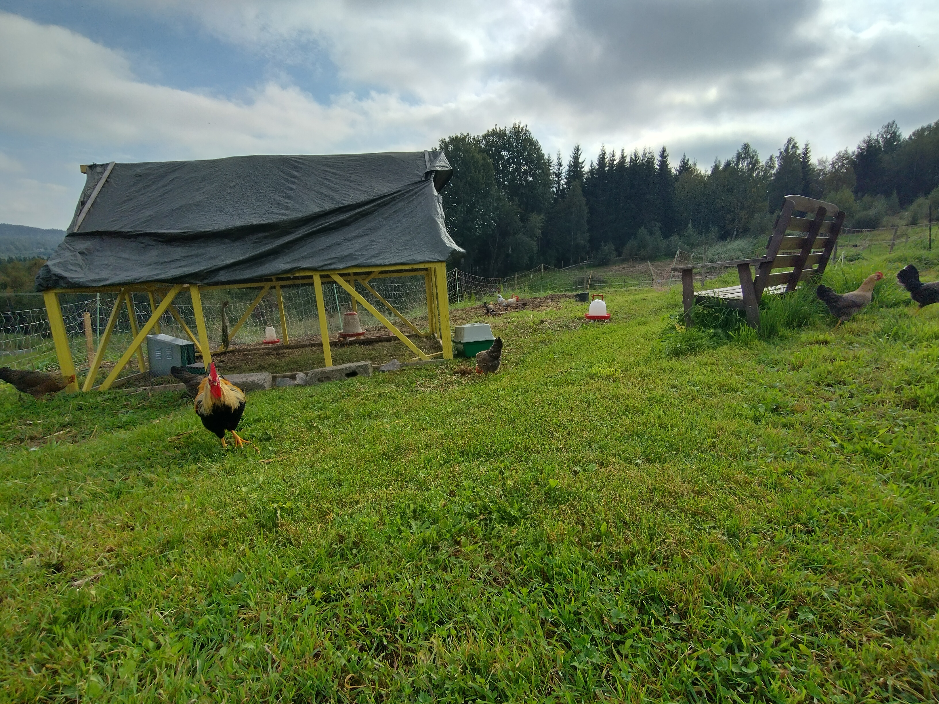 I 2023 bygde vi et gult lite hus som vi kan flytte rundt. Da fikk hønene fersk gress jevnlig, og vi fikk gjødslet et mye større areal.