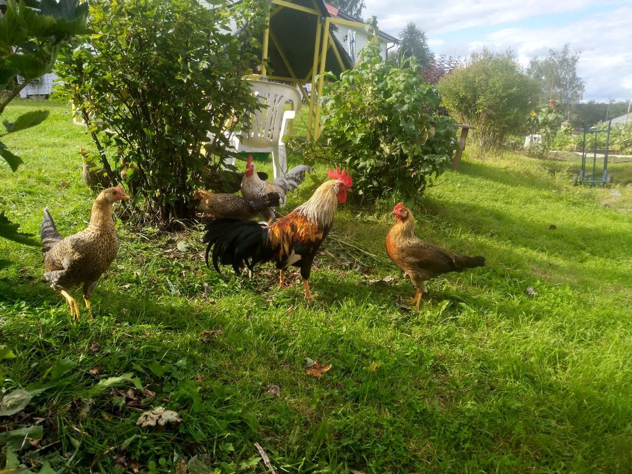 Hønene beskyttes av hanene Alf og Harne, som har allerede fått erfaring med å holde unna to hauk.