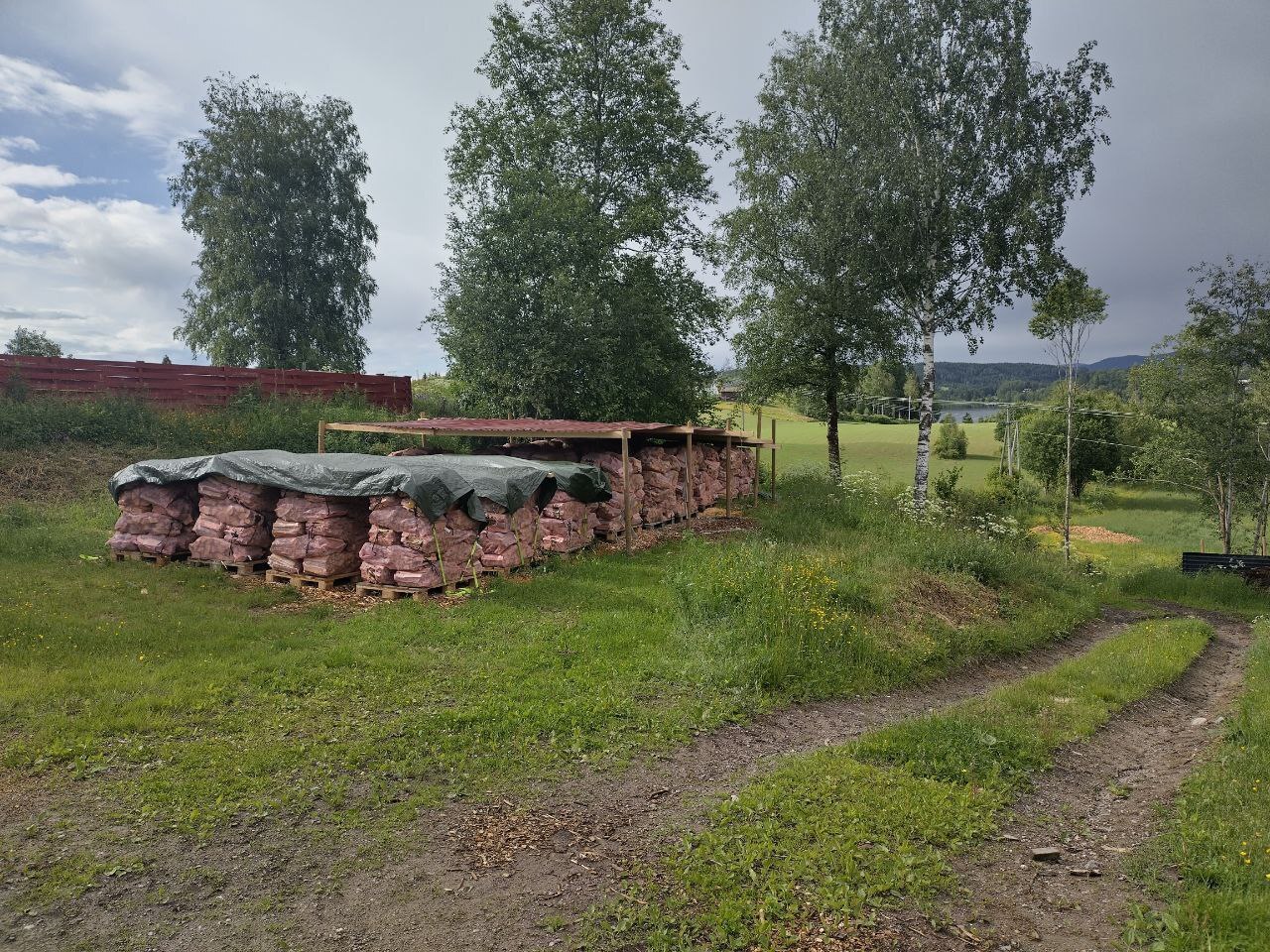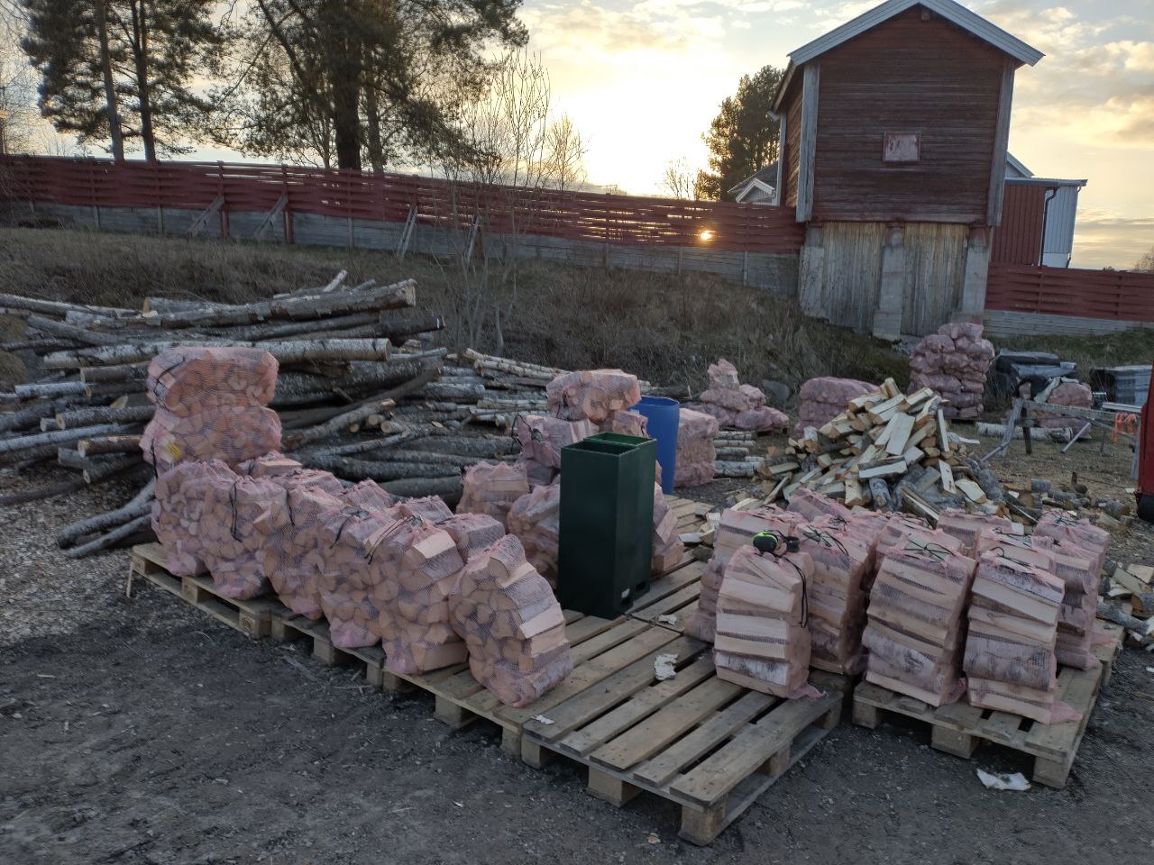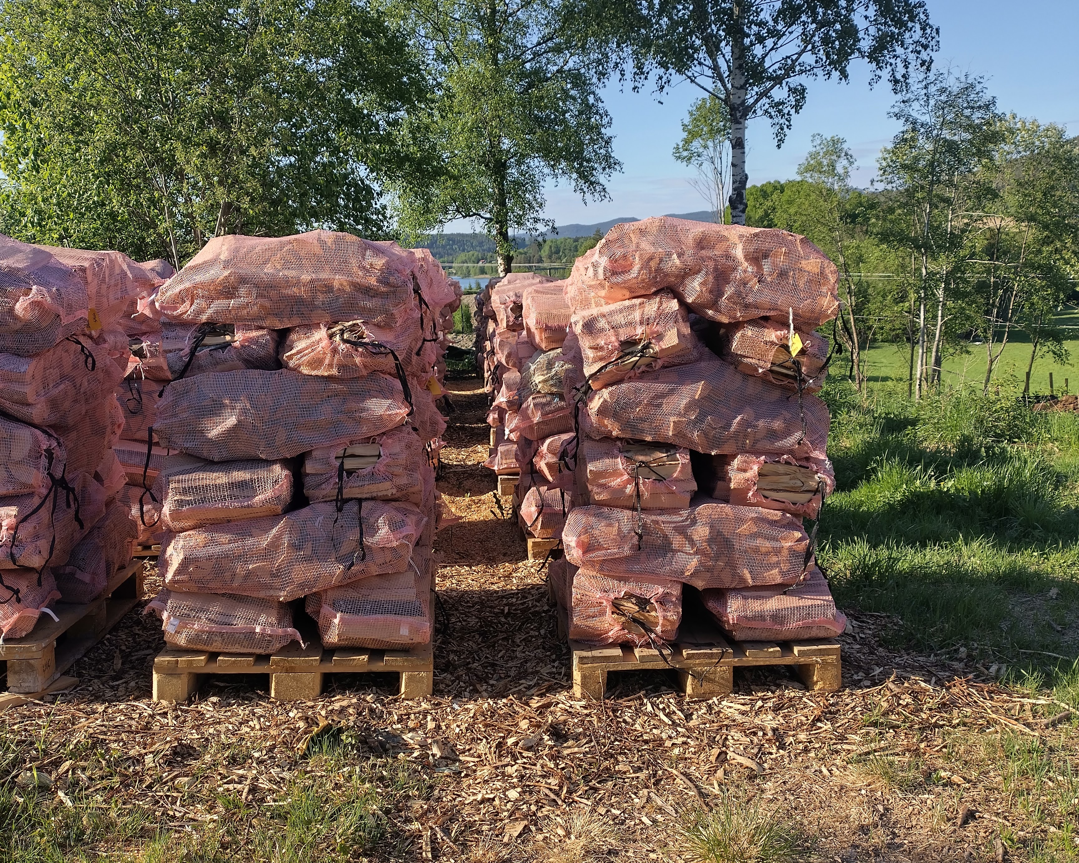 Vi bruker vinterhalvåret til styrkearbeid med å rydde områdene og skogen rundt åkeren med motorsag. Dette kløyves rundt påsketider og pakkes i 60-literssekker for salg. Lagres ute under tak og selges garantert tørr. Etter hvert vil vi også ha større mengder for salg.